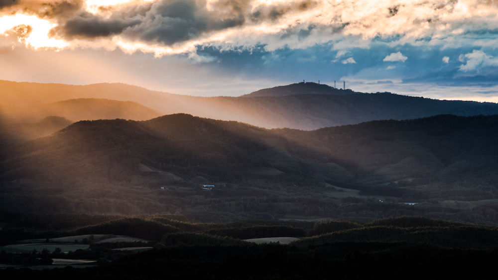 東では虹の発生が続いた中、日没近くに西で見た夕日の光芒です。地域的には旭川市となるでしょう。