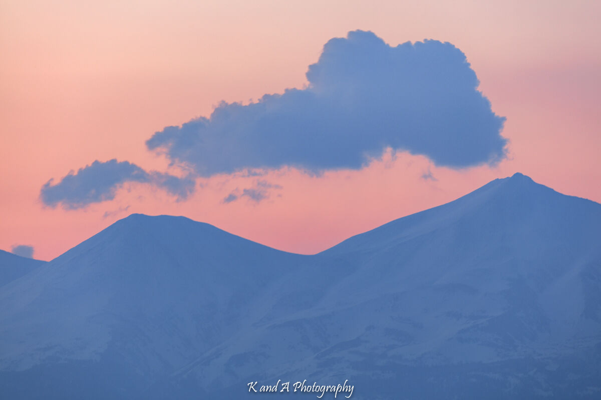 写真は4時13分撮影。実際の日の出時刻より30分以上前です。オプタテシケ山と雲。青と赤のなんとも言えない光景です。当然に明暗さが大きいので山はもっと暗く映りますが、現像は山麓の残雪がやや見えるように明るくしてあります。