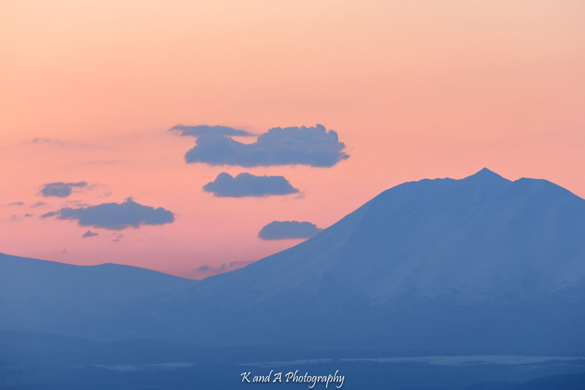 今は旭岳とこのオプタテシケ山の中間あたりから太陽が昇ってくる時期(見る場所で違う)。これからは旭岳にだんだんと寄ってくることになります。これらの写真は4時20分頃です。気象台の日の出時刻は、山の地形等を考慮しない理論上の地平線を想定しているようで、この日は4時34分日の出でしたが、実際に山の稜線から顔を覗かせるのは10数分後となります。