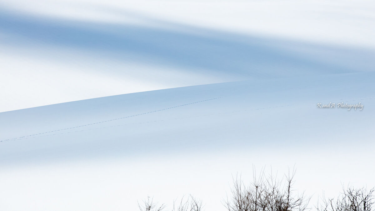 いくつもの影が丘を交差するように動きます。200mmでの撮影ですので遠景に山並みが見えますが、主役の影にスポットを合わせるために大幅にトリミングしました。画面下の低木の枝も邪魔なのですが、あと2、3m高い位置から撮りたいものです。