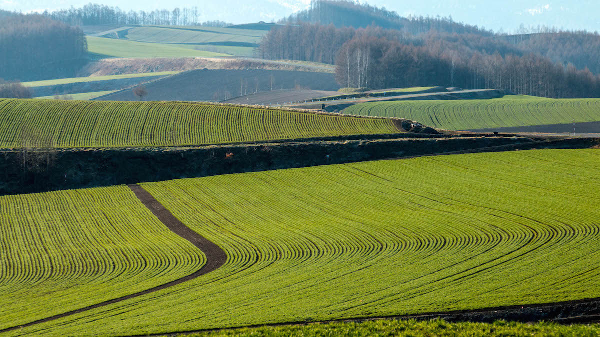 秋まき小麦が緑を増してきた。畝の筋もきれいである。美瑛は藤野の丘。