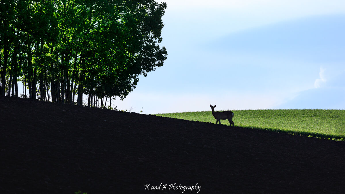 少し休憩を取る場所から100mほどのところで鹿の姿を発見し、動きを見て先回りして待って撮影したものです。写真の右の麦畑の方から林の方へと移動していました。日向の麦畑の中を行くと思ったのですが、土起こしの終えていない日陰の畑へと入ってきたので、シルエット風の写真となりました。麦畑の稜線と鹿の首が重なっているのが少々気になっていますがまあいいでしょうか(人物写真ではダメらしいです)。