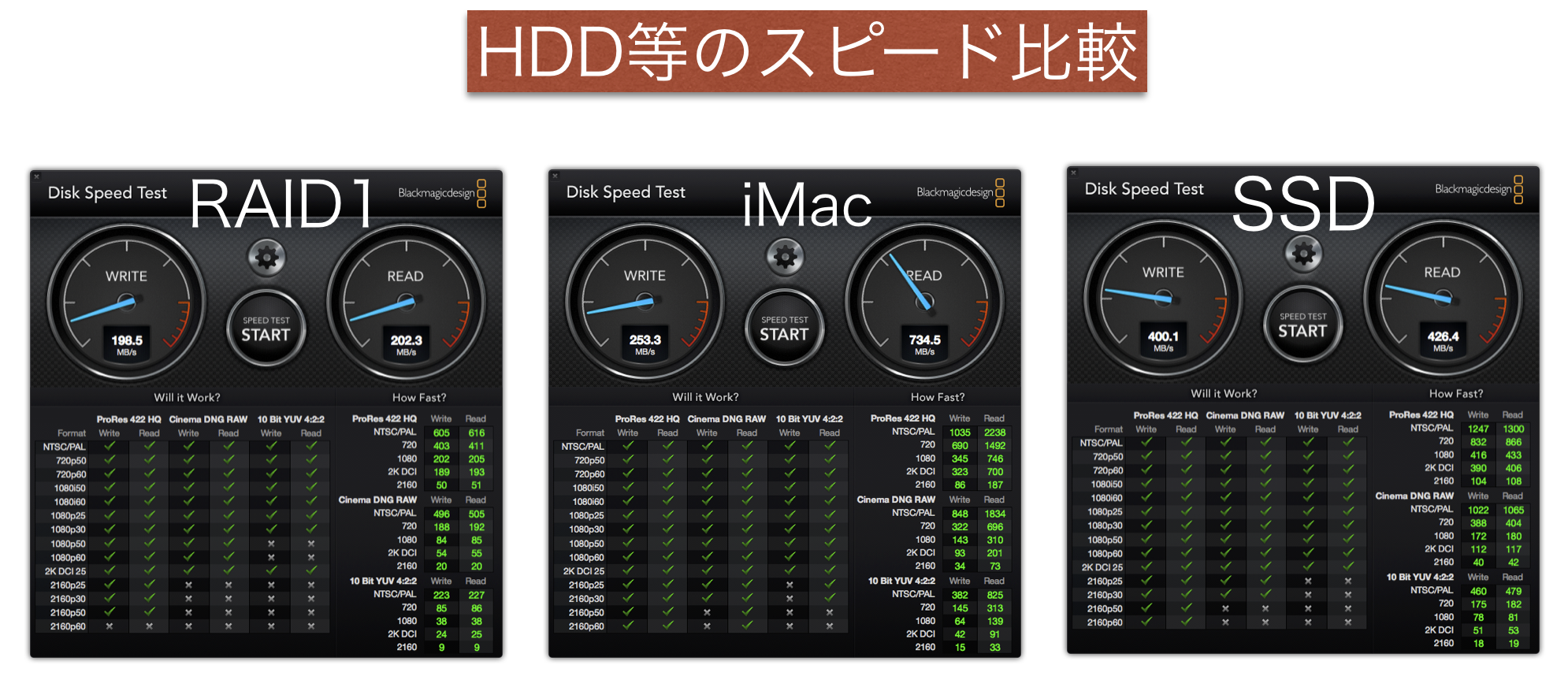 SSDの方は公称値が500MB/sほどですので、やや差があります。これは、USB3.0接続ですので、これよりも速いiMacのサンダーボルト2なら出るのかと思われます。もちろん、RAID1にしたHDDも速くなるのではと思います。とはいえ、価格的にはケース売りでもグンと高額になりますので、今回スルーした訳ですが、現時点ではほぼ満足といった感じとなりました。